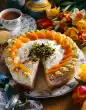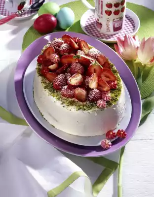 Spread the cake all around, refrigerate again. For the topping, wash, clean and halve the strawberries. Cover the cake generously with the strawberries. Sprinkle the edge with pistachios. Dust with icing sugar and decorate with sugar flowers as desired. Makes about 12 pieces
