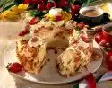 Then let it cool down a little, turn out of the tin and let it cool down completely. For the cream, soak gelatine in cold water. Cut the base into a large egg and sprinkle with Amaretto. Finely crumble the remaining dough. Stir mascarpone, lemon juice and sugar until smooth. Squeeze gelatine, dissolve lukewarm, stir into the cream. Whip 250 g cream and vanillin sugar until stiff, fold into the cream. Also stir in the dough crumbs. Spread the cream on the base, refrigerate for about 30 minutes. In the meantime, whip the remaining cream until stiff. Allow the cream firmer to trickle in.