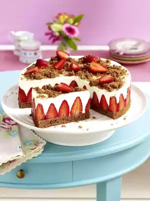 Carefully remove the cake ring from the cake. Cut the remaining strawberries in half. Before serving, decorate the cake with halved strawberries and crumbs