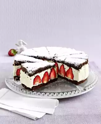 Stir in melted chocolate. Mix flour, cocoa and baking powder, sieve onto the egg mixture and fold in carefully. Line the bottom of a springform pan (26 cm Ø) with baking paper. Pour in the sponge mixture and smooth it down. Bake in the preheated oven (electric cooker: 175 °C/ convection oven: 150 °C/ gas: level 2) for 25-30 minutes. Remove the sponge cake from the edge and let it cool down on a cake rack. Wash and clean ##strawberries##. Take the base out of the tin and remove the baking paper. Cut the base in half horizontally. Cover the bottom cake layer with a cake ring or the clean edge of a springform pan. Cut the upper cake layer into 12 cake pieces. Mix quark, 150 g sugar and lemon juice. Dissolve gelatine at low heat. Stir 2-3 tbsp.