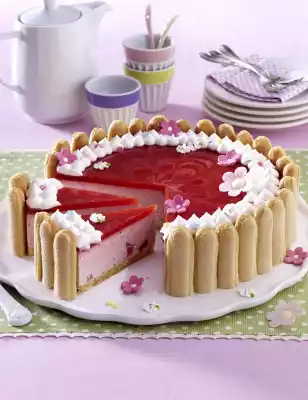 Carefully release Charlotte from the mold. Whip the rest of the cream with the whisk of the hand mixer until stiff and fill into a piping bag with a small perforated spout. Spray small tuffs onto the strawberry mirror in 2 rows. Place Charlotte with the 31 shortened lady fingers tightly around the strawberry mirror. Decorate Charlotte with the strawberry, sugar and edible paper flowers
