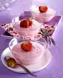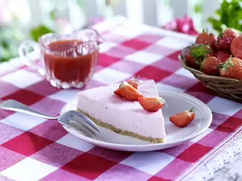 Puree 200 g strawberries with 30 g sugar. Clean and slice 2 strawberries, cut 1 in half. Decorate cheesecake with strawberry slices and halves and add strawberry sauce