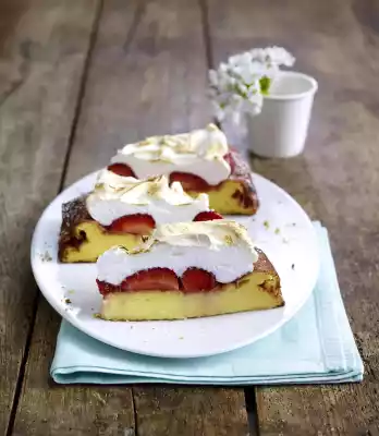 Wash, clean and halve the strawberries. Shortly before serving, take the cheesecake out of the mould and cover it tightly with strawberry halves. Drizzle with orange liqueur. For the meringue, beat the egg whites with the whisks of the hand mixer until stiff, adding 100 g sugar. Spread the meringue loosely on the strawberries and bake in a preheated oven (electric range: 175 °C/ convection oven: 150 °C/ gas: level 2) for 8-10 minutes until golden brown. Dust the edge with a little icing sugar and serve