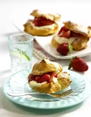 Using 2 tablespoons, spread a total of 12 piles of dough with sufficient space between the trays. Fill an ovenproof dish or cup with hot water and place on the bottom of the oven. Bake the choux pastry one after the other in the preheated oven (electric range: 225 °C/ convection oven: 200 °C/gas: level 4) for about 25 minutes. Immediately cut in half horizontally with scissors. Allow to cool down