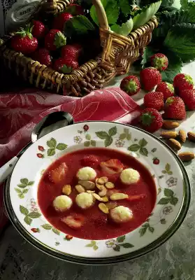 Bring the milk and vanilla sugar to the boil. Rinse the rice pudding well through a sieve and stir slowly into the milk. Let rice pudding swell at low heat for about 30 minutes. Stir occasionally. Clean and wash the strawberries. Halve about 8 pieces and put them aside. Puree remaining strawberries, currant juice and sugar with the cutting stick of the hand mixer. Brown the flaked almonds in a dry pan. Stir the egg into the rice pudding and form small balls. Fill the cold dish with the rice balls and the halved strawberries into plates and sprinkle with the almond flakes