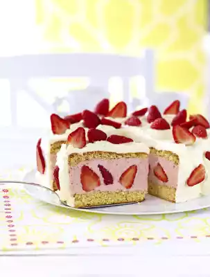 Soak gelatine in cold water. Carefully wash 1.1 kg of strawberries, drain well and clean. Pick out just under 600 g of beautiful strawberries and put them aside. Puree the rest of the strawberries, 75 g sugar and 1 packet of vanillin sugar. Squeeze out the gelatine, dissolve, stir in lemon juice and 2 tbsp. strawberry puree. Then stir the gelatine into the remaining strawberry puree and chill for 5-10 minutes. Whip 500 g cream until stiff. When the strawberry puree starts to gel, stir in the cream in portions. Spread a thin layer of strawberry cream on the sponge cake base and spread the whole strawberries on top. Spread the rest of the strawberry cream on the strawberries, smooth it down (making sure to spread it well into the spaces between the strawberries). Cover with the second, thinner sponge cake base. Cover the cake and leave to cool overnight