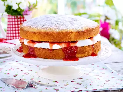 Whip the cream until stiff. Stir strawberry jam until smooth. Place a cake base on a cake plate and spread with cream. Spread the jam on top. Place the second cake base on top and sift icing sugar over it