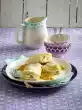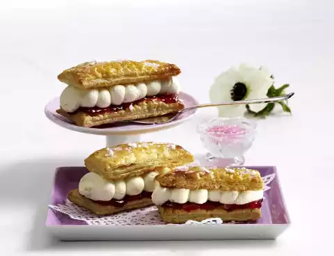 Place the slices next to each other on a baking tray lined with baking paper, prick a few times with a fork and lightly sieve with icing sugar. Bake in a preheated oven (electric cooker: 200 °C/ convection oven: 175 °C/ gas: level 3) for 15-20 minutes until the sugar has caramelised. Let the puff pastry cool down. Spread half of the slices with 1 teaspoon of jam each. Spray cream on the jam, then place another slice of puff pastry on top. Decorate slices with sugar crystals and pink sugar