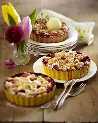Grease 4 tartlet moulds with lift-off base (top of approx. 12.5 cm Ø, base approx. 11 cm Ø, with a rim approx. 3 cm high!!!!) and dust with flour. Press a good half of the crumbled dough into the moulds as base and rim. Sprinkle about 1 tbsp. breadcrumbs on each base and spread the strawberries on top. Sprinkle with the remaining crumble. Bake in the preheated oven, bottom shelf (electric oven: 200 °C/ convection oven: 175 °C/ gas: level 3) for 40-45 minutes. Let the crumble tartlets cool in the tins on a cake rack. Remove the tartlets from the moulds, dust with icing sugar and cut in half. Serve lukewarm or cooled down. Serve with vanilla ice cream