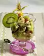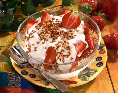 Mix orange juice, honey and possibly some cinnamon. Wash and clean the strawberries and cut them in half or quarters. Drizzle with the mixed juice. Mix quark, buttermilk and vanilla flavouring. Serve with strawberries and linseed or muesli