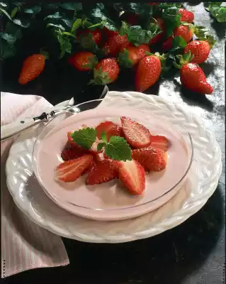 Wash, clean and drain the strawberries. Halve half of the fruit and sprinkle with 2 tablespoons of sugar. Puree the remaining strawberries, remaining sugar and vanillin sugar with the electric chopping stick. Mix strawberry puree with quark and advocaat. Divide into four glass bowls and add the sugared strawberries. Decorate with lemon balm as desired