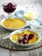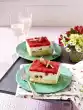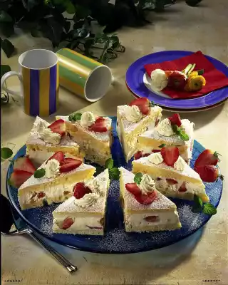 Place the second half of the dough on top and press down slightly. Smooth the edges. Let the cake cool down in the refrigerator for about 2 hours. Whip the rest of the cream until stiff. Dust the cake with icing sugar. Decorate with cream tuffs, strawberries and possibly mint leaves. Makes 8 pieces