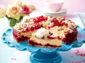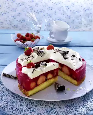 Stir the groats again and spread on the berries. Chill for at least 4 hours. Chop the dark and white chocolate coating separately. Melt each with 10 g coconut oil over a warm water bath. Spread the white chocolate on a marble or kitchen board, quickly drawing lines with a cake comb. Spread a thin layer of dark chocolate on top. Let it set. Use a spatula to scrape off rolls. Put it in a cold place. Mix 75 g sugar and cream setting agent. Whip the cream until stiff, allow the sugar mixture to trickle in. Spread the cream loosely on the cake, refrigerate again for at least 30 minutes. Decorate the cake with the remaining strawberries and chocolate rolls