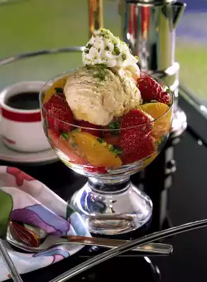 Mix strawberries, orange fillets, juice and liqueur and cover and let stand for 30 minutes. Whip the cream and vanilla sugar until stiff and fill into a piping bag with star-shaped spout. Arrange fruit and ice cream in glasses and decorate with cream.