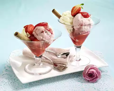 Whip the cream with the whisks of the hand mixer until stiff. Layer 125 g of puree alternately with ice in a bowl. Let it freeze again for about 1 hour, then form balls. Wash, clean and halve 150 g strawberries. Pour 2 ice cream scoops into each glass. Decorate with 125 g puree, cream, strawberry halves and ice cream wafers. Put the rest of the ice cream scoops (approx. 20 pieces) back into the freezer