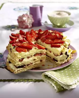 Spread 1/3 of the cream on top and cover with 1/3 of the strawberries. Drizzle with the rest of the sauce, place the last cake layer on top and spread with the rest of the cream. Spread the rest of the strawberries on top. Warm the strawberry jelly slightly and spread on the strawberries. Sprinkle with almond flakes. Put the cake in a cool place for about 1 hour