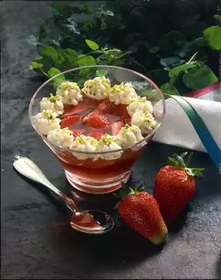 Soak gelatine in plenty of cold water. Fill strawberries in portions into small bowls. Squeeze the gelatine, dissolve, stir into the juice and pour over the fruit. Leave to set in the fridge.