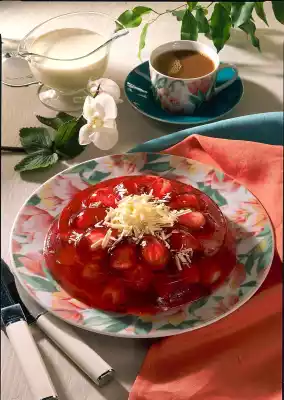 Soak gelatine in plenty of cold water. Mix wine, 1/4 litre water, icing sugar and lemon juice. Squeeze out the gelatine, dissolve at low heat and stir into the wine mixture. Rinse a pudding mould (1 1/4 litre capacity) with cold water. Pour a thin layer of wine on the bottom of the mould, place the mould in a cool place for about 15 minutes.