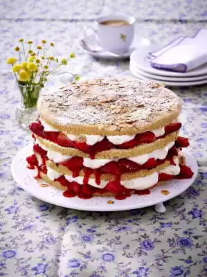 Halve the sponge cake base once horizontally. Stir cream cheese with 4 tablespoons of sugar until smooth and stir in 1 sachet of cream firming agent. Whip the cream until stiff (not too stiff) and pour in 1 sachet of cream firming agent. Fold the cream into the cream cheese mixture. Spread 1/3 of the strawberries on a sponge cake base, then spread 1/3 of the cream cheese cream on top of the strawberries and spread carefully. Place another sponge cake base on top, press down lightly and process 2 further layers in the same way, finishing with the top layer. Chill the cake for at least 1 hour and dust with icing sugar.