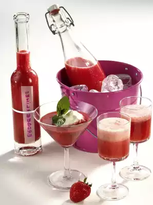 Serving tip: Shake the strawberry limes if necessary and pour into 8-10 glasses. Fill up with cool sparkling wine or add 1 blob of whipped cream. Decorate with mint