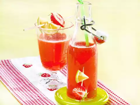 Stir in the strawberry puree. Pour cooled mineral water over strawberry lemonade and serve immediately. Decorate skewers with strawberry lime