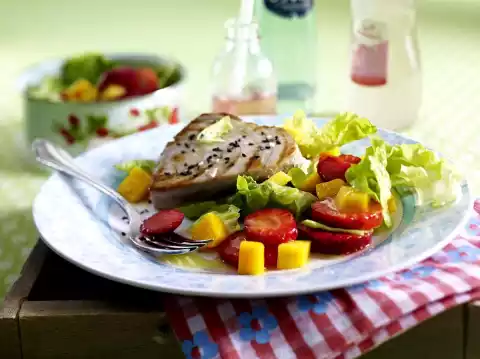 Fry the tuna steaks on each side, depending on their thickness, for 2-3 minutes, remove and season with sesame salt. Mix salad, strawberries, mango and vinaigrette, season with salt, pepper and sugar.