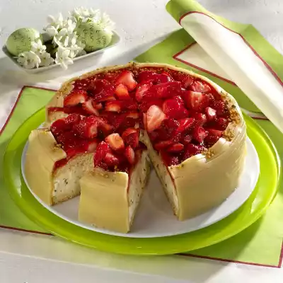 Place in a cool place and leave to set for about 2 hours. Wash the strawberries, drain, clean and cut in half. Lay on the cake in a dome-shaped layer. Mix the cake glaze powder and 20 g sugar in a small saucepan and gradually stir in 250 ml water. Bring everything to the boil while stirring. Spread the icing on the strawberries with a tablespoon and let it set. Knead the marzipan with icing sugar and roll out to a long, approx. 8 cm wide strand. Carve a pattern with a grid cutter as desired. Remove the cake from the cake ring. Place the marzipan around the edge and press down carefully. Fold the excess marzipan over the edge of the cake. Sprinkle cake with remaining brittle