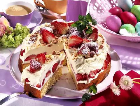 Spread 1/4 mascarpone cream on the cake base. Spread strawberries, except for 10 halves, on top. Spread the rest of the cream on top. Decorate with crumbled Amarettini, the rest of the strawberries, icing sugar and lemon balm