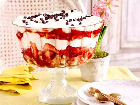 Coarsely crumble the lady fingers. Pour into a bowl (approx. 1.75 l capacity). Spread half of the strawberry jam mixture on the sponge crumbs. Add half of the mascarpone cream. Add the rest of the strawberry jam mixture. Spread the rest of the mascarpone cream on top.