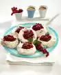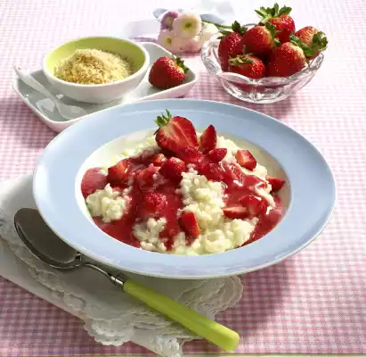 Boil up the milk. Stir rice, vanilla sugar, grated coconut and 2 tablespoons of sugar into the milk. Simmer for 3 minutes. Wash the strawberries, (put 2 aside for decoration) clean and cut half into small cubes. Puree the other half and 30 g sugar.