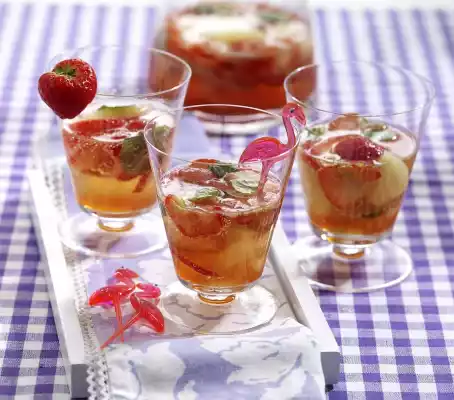 Wash the lime hot, grate dry and grate the peel thinly with a fine grater. Halve the lime, squeeze the juice. Wash the mint, shake dry and pluck the leaves from the stalks. Wash and clean the strawberries and cut into thin slices. Mix strawberries, mint, pineapple with juice, rum, sugar, lime juice and peel and leave to marinate in a cool place for about 1 hour. Pour into a punch bowl and fill up with mineral water and prosecco just before serving
