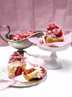 Whip the cream until stiff. Stir the jam until smooth and fold loosely into the cream. Spread on the muffins and spread a little. Wash and clean 150 g strawberries and cut them crosswise into slices. Cover the muffins with popcorn and strawberries, while carefully pressing the popcorn slightly