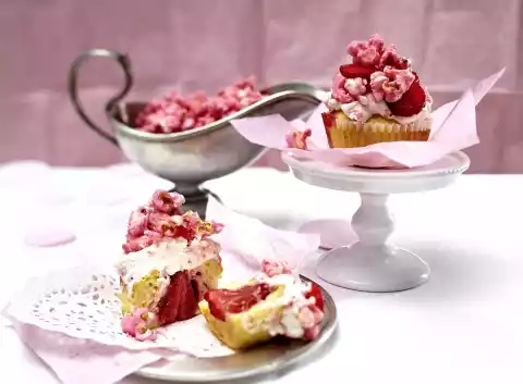 Whip the cream until stiff. Stir the jam until smooth and fold loosely into the cream. Spread on the muffins. Wash and clean 150 g strawberries and cut them crosswise into slices. Decorate the muffins with popcorn and strawberries, carefully pressing the popcorn down.