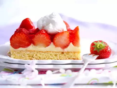 Spread the dough evenly on the fat pan. Bake in a hot oven for about 20 minutes. Let it cool down. In the meantime wash, drain and clean the strawberries. Halve or quarter large strawberries.
