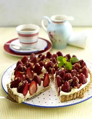 Put flour, 100 g sugar, salt, vanillin sugar, baking powder, egg and butter in flakes in a mixing bowl. Knead first with the dough hooks of the hand mixer, then with your hands to a smooth dough. Roll out the dough to a circle (approx. 31 cm Ø) on a well floured work surface. Carefully place the dough into a greased, flour-dusted tart mould (26 cm Ø) with lift-off base. Carefully press down the rim, pulling the edge of the dough 1-2 mm higher than the edge of the mould. Prick the base several times with a fork and chill for approx. 1 1/4 hours. Then bake in the preheated oven (electric range: 200 °C/ convection oven: 175 °C/ gas: level 3) on the lower rack for 20-25 minutes.