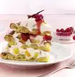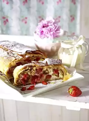 Sprinkle almonds on this half. Add the curd mixture and spread, leaving about 3 cm free at the sides. Sprinkle the cantuccini and strawberries on the quark mixture. Whip the sides over the filling and roll up the strudel using the tea towel. Slide onto a baking tray lined with baking paper. Spread with butter. Bake in a preheated oven (electric cooker: 200 °C/ convection oven: 175 °C/ gas: see manufacturer) for approx. 35 minutes. Remove from oven, brush with remaining butter and let cool down a little. Serve dusted with icing sugar. Add the sauce