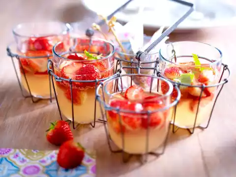 Wash the strawberries, drain in a sieve, clean and halve. Mix strawberries, vanilla sugar and sugar in a bowl, let it stand for about 1 hour. Stir carefully several times.
