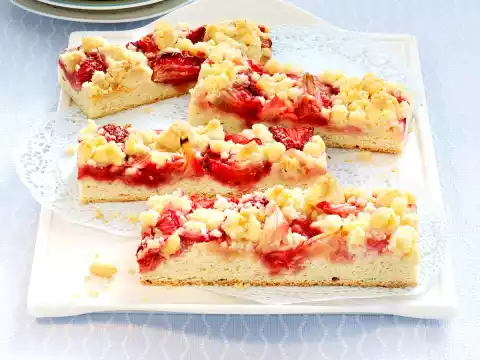 Let it rise again in a warm place for about 20 minutes. In the meantime clean, wash and cut the rhubarb into pieces. Wash, clean and halve the strawberries. Sprinkle the yeast dough with coconut flakes. Spread rhubarb and strawberries evenly on the cake. Sprinkle with crumbles and bake in the preheated oven (electric range: 200 °C/ convection oven: 175 °C/ gas: level 3) for approx. 25 minutes. Remove from the oven, place on a cake rack and allow to cool. Cut the cake into strips and arrange on a plate