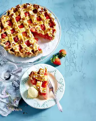 Slide the dough grid from the cake plate onto the cake. Cut off any excess dough and press the grid around the edge of the cake. Mix egg yolk and 2 tbsp. water. Spread a thin layer of the dough onto the strips. Sprinkle with sugar crystals. Bake in a preheated oven (electric cooker: 200 °C/ convection oven: 175 °C/ gas: see manufacturer) for approx. 1 hour. Cover with aluminium foil after about 45 minutes. Remove from the oven and let cool on a cake rack. Remove the tart from the tin and dust with icing sugar. Serve with vanilla ice cream.