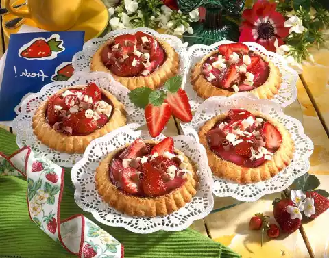 Cut off any excess dough. Prick the pastry base several times with a fork. Place the cakelets on the grid of the oven and bake in the preheated oven (electric: 200 °C / gas: level 3) for 18-20 minutes. Turn out of the tartlets and let them cool down. Break 80 g dark chocolate into pieces and melt in a hot water bath. Spread the chocolate on the cakelets and allow to dry. Clean, wash and cut the rhubarb into pieces. Bring rhubarb, 100 ml water, remaining sugar, vanillin sugar and lemon zest to the boil. Stir cornflour and 4 tablespoons of cold water until smooth, stir into the rhubarb and bring to the boil again. Leave to cool slightly. Wash the strawberries, dab dry, clean and cut in half.