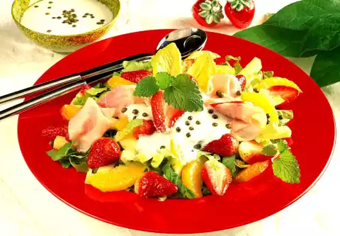 Squeeze the rest of the fruit. Collect the juice. Clean, wash and halve the strawberries. Cut cheese into small pieces. Mix the prepared ingredients carefully. Arrange the smoked pork loin on top. For the sauce, mix yoghurt, sour cream, 5 tablespoons of pressed orange juice and pickled pepper.