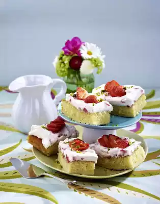 Wash and clean the strawberries. Dice 400 g strawberries, cut the rest into slices. Mix quark with 100 g sugar. Mix vanillin sugar and cream setting agent. Whip the cream until very stiff, allow the cream firming mixture to trickle in. Fold cream and strawberry cubes into the quark. Spread the cream on the cake and cut into pieces. Decorate pieces with strawberry slices and sprinkle with pistachios. Keep the cake cold until serving