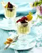 In the meantime, whisk 6 eggs, 275 g sugar and salt with the whisk of the hand mixer until thick and creamy. Add oil and yoghurt and stir in. Mix 150 g flour, semolina and baking powder, add bit by bit and stir in. Pour the mixture onto the pre-baked base and spread. Bake at the same temperature on the bottom rack for another 15-20 minutes. Let it cool down on a cake rack