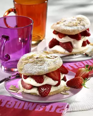 Mix flour, starch and baking powder. Sift portions onto the egg mixture and fold in. Spread the sponge mixture evenly with a tablespoon over the 8 circles and smooth it down. Bake in the preheated oven (electric cooker: 200 °C/ convection oven: 175 °C/ gas: level 3) for 9-11 minutes until golden brown. Remove from the oven, carefully remove from the baking paper and allow to cool on a rack. In the meantime, wash and clean the strawberries, drain them in a sieve and cut them in half or quarters depending on size. Roast the flaked almonds in a pan without fat until golden brown. Remove from the pan and put aside. Mix quark, mascarpone, 1 packet of vanillin sugar, lemon juice and 75 g sugar. Spread cream and strawberries evenly on half of the sponge cake.