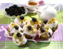 Let it cool down a little on a cake rack. Use a knife to carefully remove the tartlets from the edge and turn them out of the moulds. Let them cool down. In the meantime clean, wash and quarter the strawberries. Mix pudding powder and 6 tablespoons of milk.
