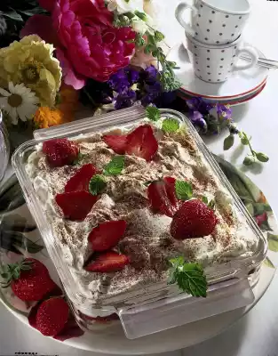 Layer soaked lady fingers, strawberry halves, up to 10 pieces to decorate, and curd mascarpone cream in a mould. Mix icing sugar and cocoa and sieve onto the Tirami-Su. Serve decorated with remaining strawberries and lemon balm.