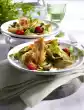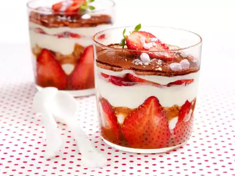 Spread the rest of the cream on the strawberries and chill for about 30 minutes. Cut 2 strawberries in half. Dust the cream with cocoa before serving. Decorate with strawberry halves and crumbled meringue.