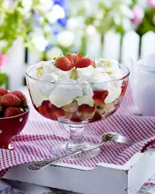 Mix strawberry jam and spread on the lady fingers. Pour vanilla sauce over it and let it cool down. Wash the strawberries, dab dry and cut in half. Roast the flaked almonds in a pan without fat, remove. Whip 250 g cream until stiff. Finally pour in icing sugar. Spread the cream on the vanilla sauce layer, decorate with strawberries and flaked almonds