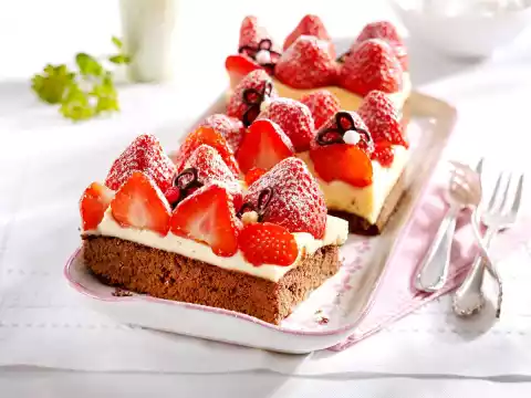 whisk with the whisk of the hand mixer for 5-8 minutes until thick and creamy. Mix flour and baking powder. Add the chocolate butter mixture to the egg cream and stir in. Sift the flour mixture over the egg cream and stir in briefly. Grease the oven pan (approx. 32 x 39 cm) and dust with flour. Add the dough and smooth it down. Bake in the preheated oven (electric cooker: 175 °C/ convection oven: 150 °C/ gas: level 2) for 20-30 minutes. Let cool on a cake rack. Wash and clean the strawberries and drain well. Mix pudding powder with 150 g sugar. Stir with 250 ml milk until smooth. Bring 750 ml milk and cream to the boil in a saucepan and remove from the heat. Stir in the pudding powder and let it simmer for at least 1 minute while stirring. Immediately spread evenly on the base. Spread the strawberries on top and press them down, let them cool down. Chop 50 g chocolate and melt over a warm water bath. Pour into a small piping bag. Spray ornaments (flowers etc.) on baking paper and decorate with sugar pearls, allow to set. Dust the cake with icing sugar and cut into pieces. Decorate with chocolate ornaments