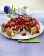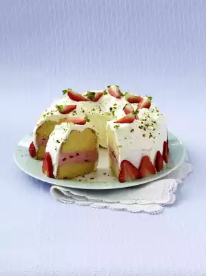 Squeeze out the gelatine, dissolve, stir in 2 tbsp. cream, stir into the remaining cream. Fold in whipped ##cream## and chill until the mixture starts to gel. Cut the cake in half horizontally. Place the bottom half in the edge of the springform pan. Spread the gelling cream on top. Place the upper half of the cake on top. Chill the cake for 30-45 minutes. Whip the rest of the cream until stiff. Cut uncooked strawberries into quarters, remaining strawberries into slices. Remove the cake from the edge of the springform pan and spread the cream all around. Decorate with strawberries and sprinkle with ##pistachios##.